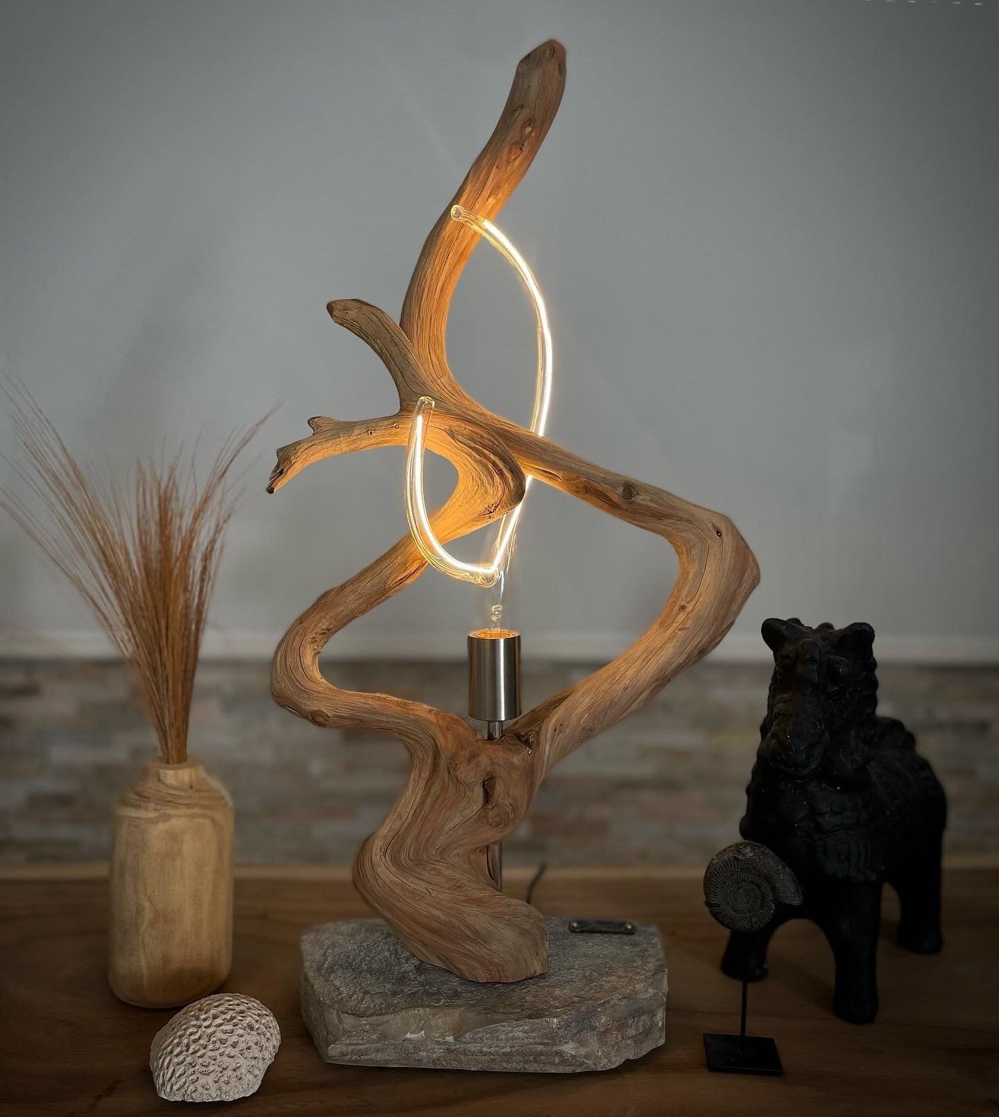 Todas y cada una de nuestras obras son únicas y especiales, ya que cada pieza tiene su propia forma, tamaño, color... Trabajamos con dos materiales naturales, la madera y la piedra, siempre fundiéndose entre sí con bombillas de diseño moderno.