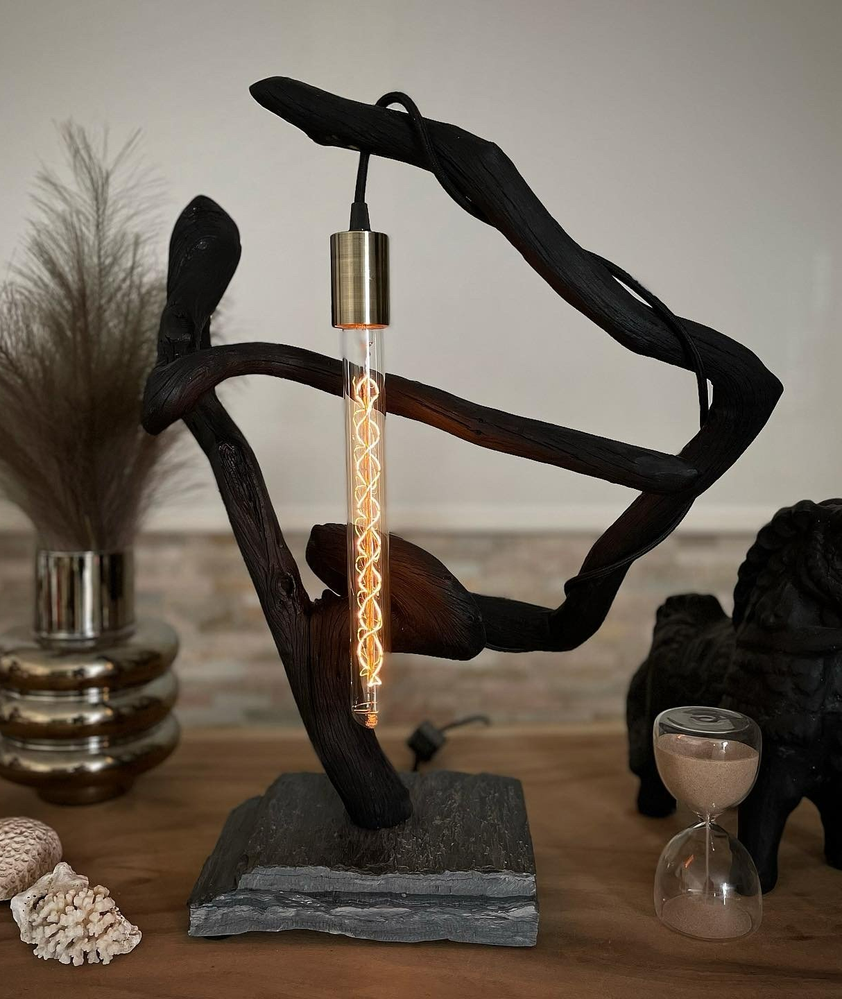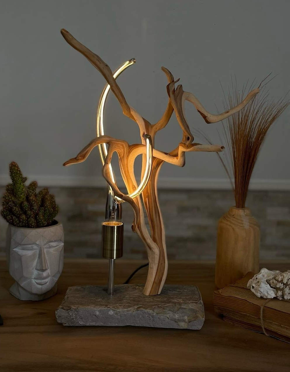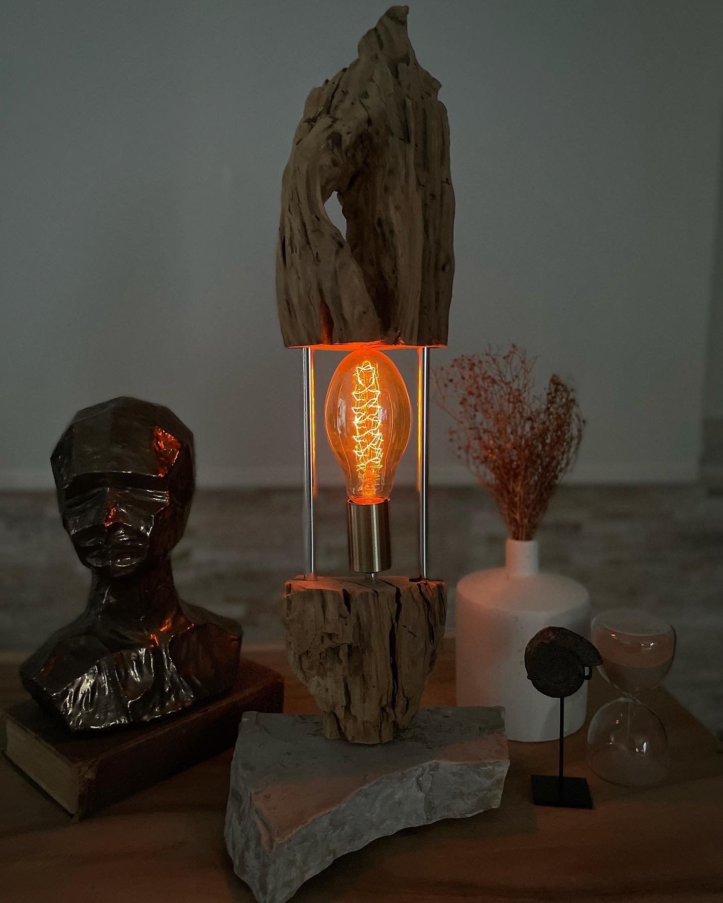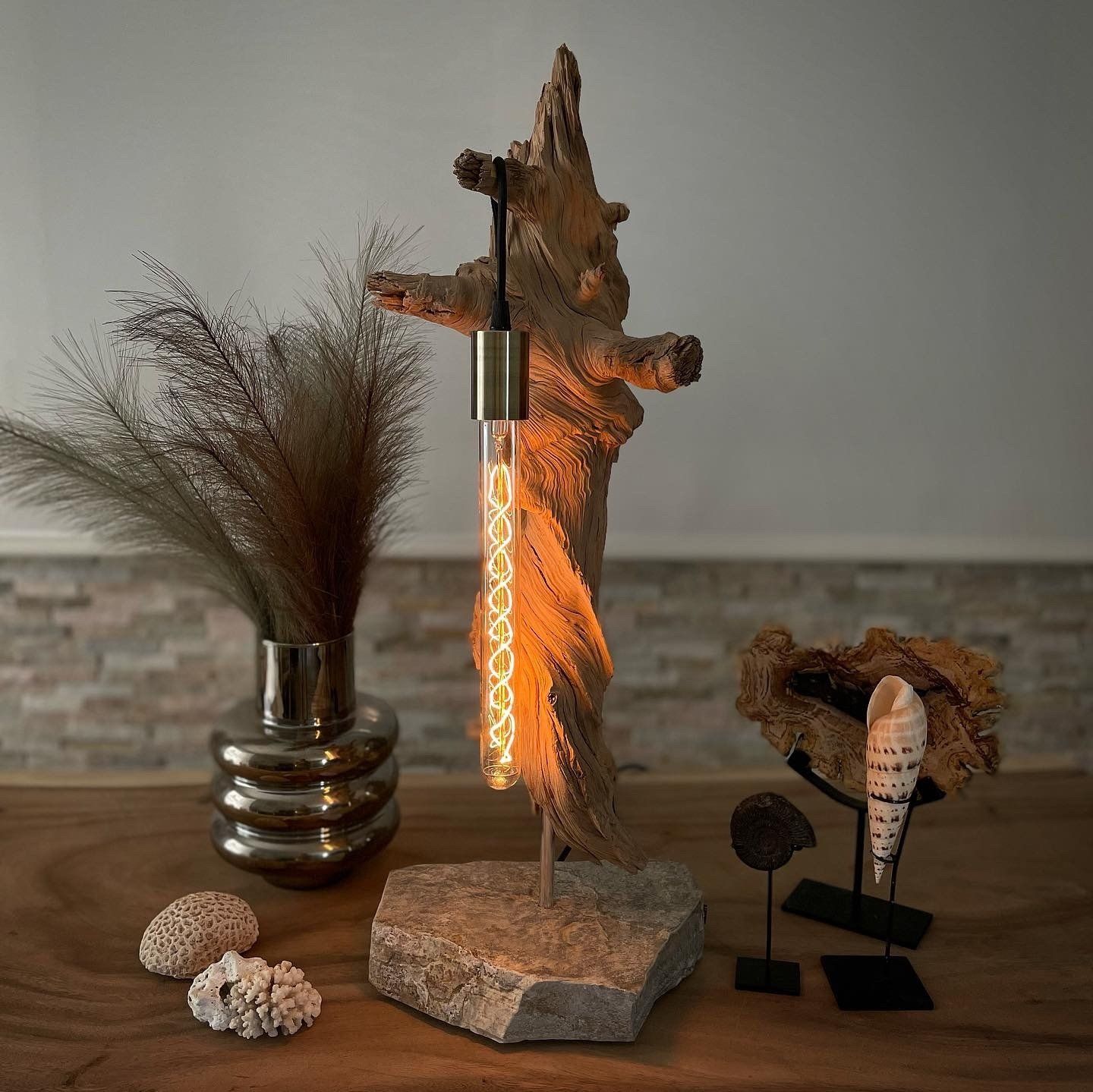 Todas y cada una de nuestras obras son únicas y especiales, ya que cada pieza tiene su propia forma, tamaño, color... Trabajamos con dos materiales naturales, la madera y la piedra, siempre fundiéndose entre sí con bombillas de diseño moderno.
